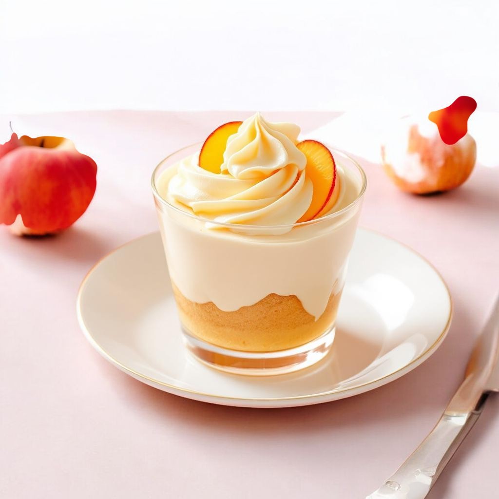 Vaso de torta de durazno, un postre cremoso con capas de durazno fresco y suave bizcocho.